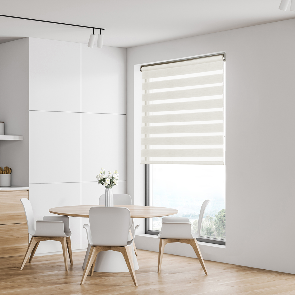 Diseñado con un tejido deslizante con bandas transparentes y opacas, permitiéndote regular la luminosidad a tu gusto para un óptimo confort visual.